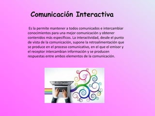 El documento trata sobre varios temas relacionados con la comunicación digital. Describe la comunicación digital como una fusión del periodismo con nuevas técnicas informáticas donde lo analógico se convierte en digital. También habla sobre la comunicación interactiva que permite el intercambio de conocimientos entre emisor y receptor, así como sobre las diferentes versiones de la web y características del hipertexto. Por último, define conceptos como blogs, redes sociales, chats y wikis como herramientas digitales para la comunicación.