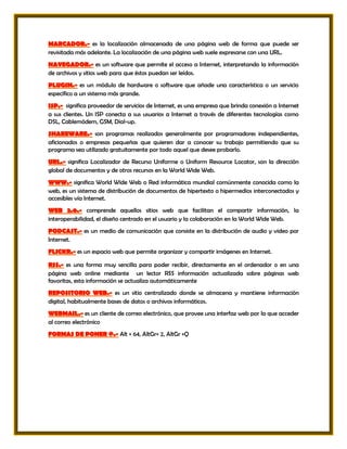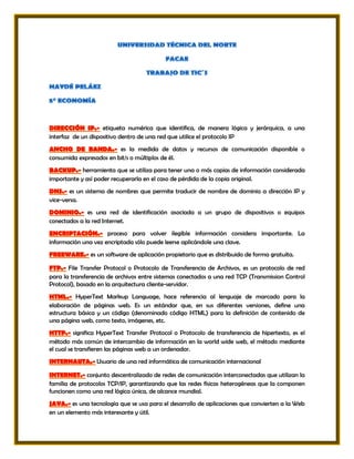 El documento define varios términos relacionados con la tecnología de la información y las comunicaciones. Define dirección IP, ancho de banda, copia de seguridad, sistema de nombres de dominio, red privada virtual, encriptación, software libre, protocolo FTP, lenguaje HTML, protocolo HTTP, usuario de Internet, red TCP/IP, tecnologías web, marcadores, navegador web, módulo, proveedor de servicios de Internet, software libre, URL, World Wide Web, web 2.0, streaming, sitio de almacenamiento de