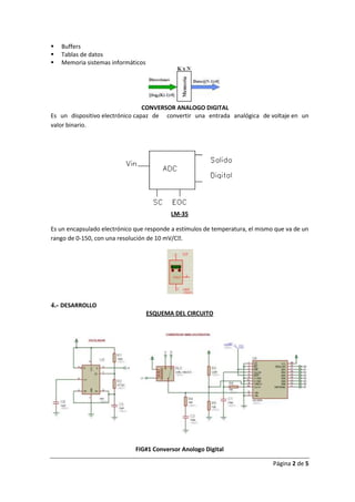 Este documento presenta el diseño de un control de temperatura para termo cunas en un hospital utilizando un conversor analógico-digital y sensores de temperatura LM35. El control muestrea la temperatura cada 4 segundos y la muestra en tres displays de 7 segmentos indicando la temperatura y si la termo cuna está funcionando. El diseño usa un microcontrolador, memoria EEPROM, comparadores y otros componentes electrónicos para lograr el control de temperatura.