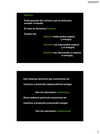 El documento trata sobre termoquímica. Explica que la termoquímica estudia el intercambio energético de sistemas químicos con el exterior. Define conceptos como sistemas abiertos, cerrados y aislados, y reacciones exotérmicas y endotérmicas. También introduce variables de estado, funciones de estado, calor, temperatura y energía interna.