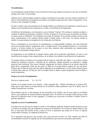1) La termodinámica estudia los procesos de transferencia de energía como calor y trabajo. 2) Define el calor como una transferencia de energía debido a una diferencia de temperatura, mientras que el trabajo no depende de la temperatura. 3) Establece conceptos como sistema, ambiente, sistema cerrado, abierto e introduce las leyes de la termodinámica.