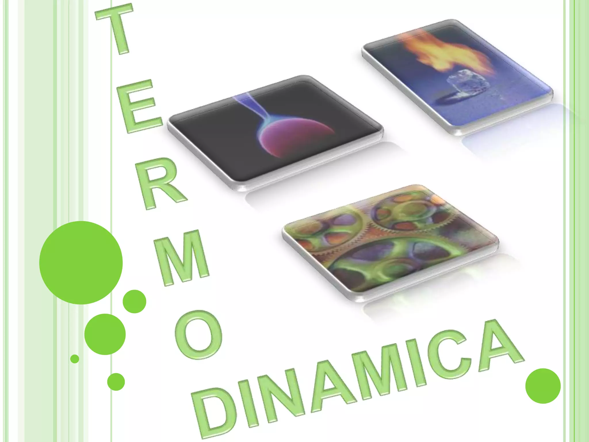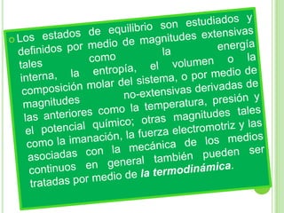 La termodinámica describe los estados de equilibrio macroscópico y estudia cómo la energía se transforma entre sistemas. Las leyes de la termodinámica establecen que la energía se conserva, los procesos naturales ocurren en una dirección hacia el equilibrio térmico, y la entropía de un sistema aislado nunca disminuye. La termodinámica tiene aplicaciones importantes como el estudio de motores y reacciones químicas.