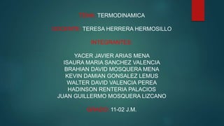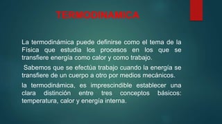 Este documento presenta información sobre termodinámica para un grupo de estudiantes de grado 11. Explica conceptos clave como temperatura, calor, energía interna y las leyes de la termodinámica. También describe procesos termodinámicos como cambios de estado de la materia a través de fusión, ebullición, solidificación y condensación.