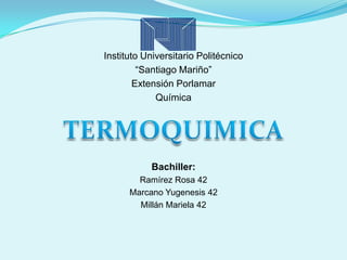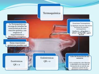 Este documento resume conceptos clave de termoquímica y termodinámica. Explica que la termoquímica estudia las características de las reacciones químicas en relación con la energía liberada o absorbida, mientras que la termodinámica describe los estados de equilibrio de un sistema termodinámico en términos de propiedades como la energía interna y la entropía. También presenta ejemplos de ecuaciones termoquímicas y conceptos como el calor de formación y los estados de