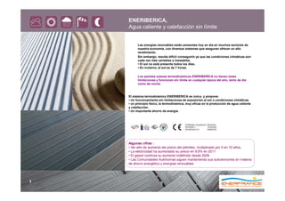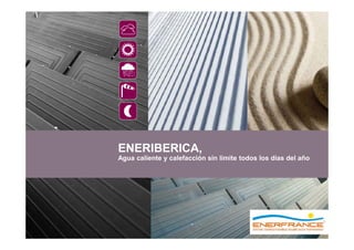 El documento describe el sistema de calefacción y agua caliente ENERIBERICA, el cual utiliza la termodinámica para proporcionar energía sin límite todos los días del año independientemente de las condiciones climáticas. El sistema funciona captando calor del sol, la lluvia o el viento las 24 horas del día los 365 días del año gracias a un panel solar termodinámico ligero y de pequeño tamaño que transfiere el calor a un compresor. Esto permite un ahorro energético de hasta un 90% en comparación