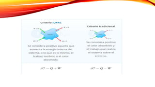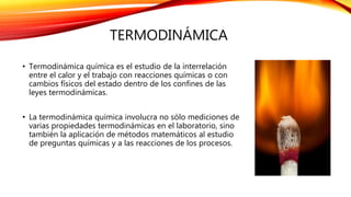 El documento habla sobre la termodinámica y el equilibrio químico. Explica que la termodinámica química estudia la relación entre el calor y el trabajo en reacciones químicas. Luego resume las tres leyes de la termodinámica, incluyendo que la primera ley establece la conservación de la energía, la segunda ley establece que la entropía siempre aumenta, y la tercera ley indica que la entropía llega a cero a temperatura cero.