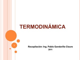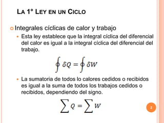 La primera ley de la termodinámica establece que la suma de todos los calores cedidos o recibidos es igual a la suma de todos los trabajos cedidos o recibidos. La energía total de un sistema cerrado depende solo del estado inicial y final y no de la trayectoria, y se designa como E. La energía interna U es la suma de la energía cinética y potencial molecular, mientras que la entalpía H es la suma de U y la presión por el volumen.