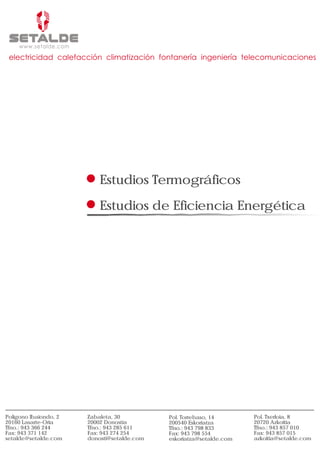 Este documento describe los estudios termográficos y de eficiencia energética realizados por SETALDE. La termografía infrarroja permite medir temperaturas de superficie sin contacto y detectar problemas eléctricos, mecánicos o de fabricación mediante cambios de temperatura. Los estudios termográficos ayudan en el mantenimiento preventivo al identificar puntos calientes y minimizar riesgos de fallos. También se usan para inspeccionar suelos radiantes e instalaciones eléctricas, mejorar la eficiencia