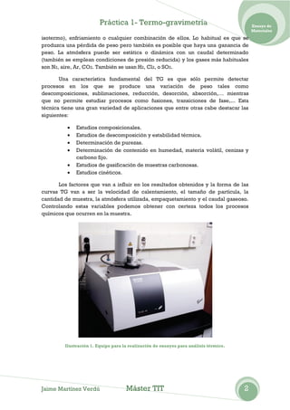 El documento describe la técnica de análisis termo-gravimétrico (TG) y su aplicación para estudiar la descomposición del oxalato de calcio monohidratado. La TG mide la pérdida de peso de una muestra con la temperatura. La descomposición del oxalato de calcio ocurre en tres etapas asociadas con la pérdida de agua, monóxido de carbono y dióxido de carbono, respectivamente. La curva TG y DTG (derivada de la curva TG) muestran claramente estas etap