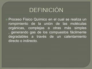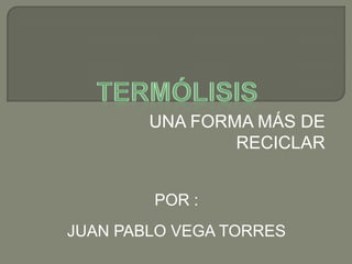 El documento describe el proceso de termólisis o fusión como una forma más de reciclar residuos sólidos. La termólisis implica aplicar presión y calor a los residuos en ausencia de oxígeno para romper las moléculas en gases y carbón combustible. Estos productos pueden usarse para generar energía eléctrica. La termólisis es una alternativa moderna y segura para procesar el 99% de los residuos urbanos e industriales y convertirlos en recursos útiles.