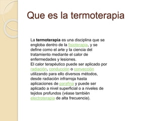 La termoterapia es una técnica de fisioterapia que utiliza el calor para tratar enfermedades y lesiones. El calor se puede aplicar de varias formas como radiación infrarroja o parafina. Los efectos del calor incluyen aumentar la circulación sanguínea, reducir la inflamación y el dolor, y mejorar la digestión y la eliminación de toxinas. La termoterapia se usa para tratar dolores reumáticos y cólicos, y puede tener contraindicaciones en casos de inflamaciones agudas, problemas card