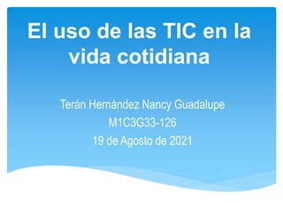 El documento describe los usos de las tecnologías de la información y la comunicación (TIC) en la vida cotidiana, incluyendo cómo facilitan las tareas diarias y la comunicación, proveen fácil acceso a información, y son usadas en el hogar, educación y trabajo. Las TIC se han vuelto omnipresentes en la sociedad actual gracias a avances tecnológicos y reducciones de costo que las han hecho más accesibles para personas y empresas.