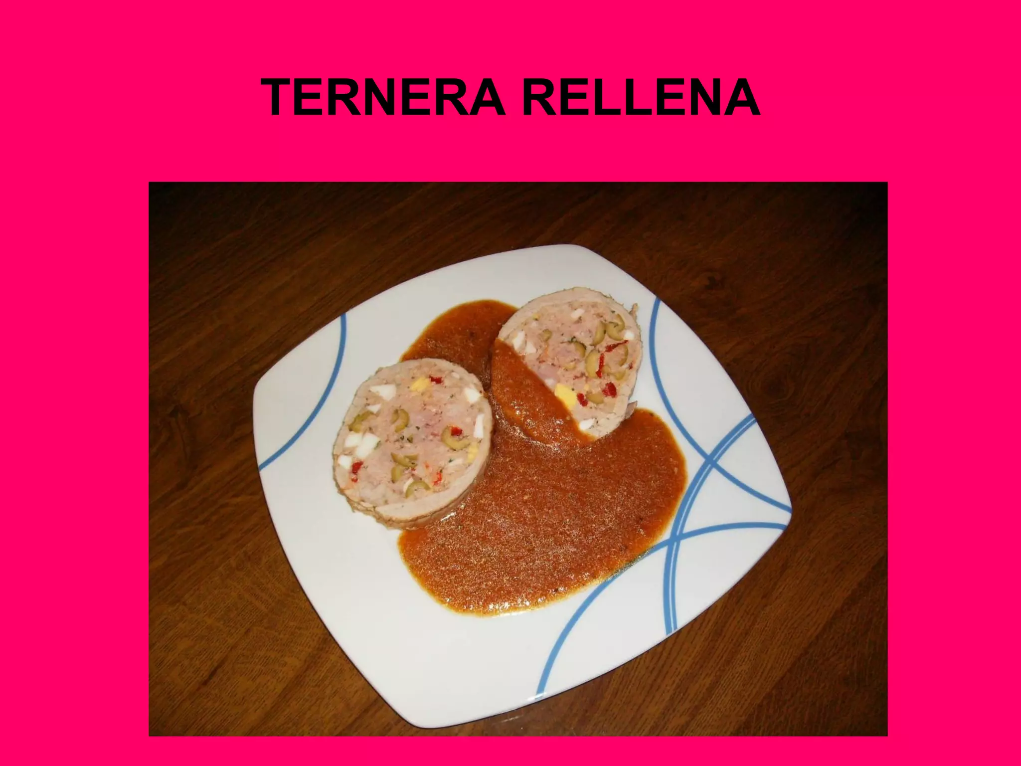 Este documento proporciona instrucciones para preparar ternera rellena. Incluye una lista de ingredientes como filete de ternera, picada de ternera, huevos, aceitunas, pimientos y ajos. Explica cómo cortar los ingredientes y mezclarlos para hacer el relleno y cómo enrollar el filete de ternera alrededor del relleno. También incluye instrucciones para hacer una salsa de acompañamiento con tomates, pimientos, cebolla y vino blanco.