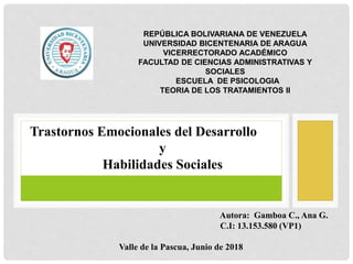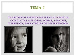 El documento aborda los trastornos emocionales del desarrollo en la infancia, enfocados en la ansiedad, miedos y fobias, así como en las inhabilidades sociales y conductas disruptivas que pueden surgir. Se discuten las causas de la ansiedad, su relación con el comportamiento parental, y se detallan los tipos de fobias y trastornos de ansiedad, así como estrategias de intervención y tratamiento. También se analiza la desobediencia y agresividad como problemas emergentes y la necesidad de una evaluación integral que incluya a padres y educadores en el proceso de intervención.