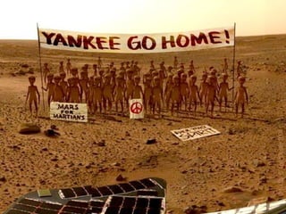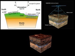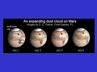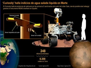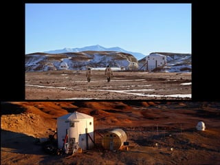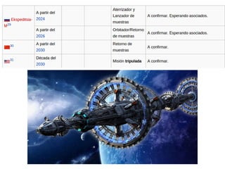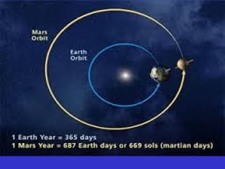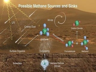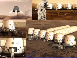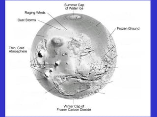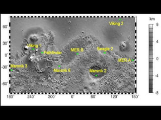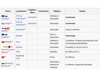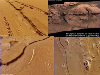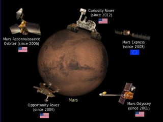 El documento describe la exploración del planeta Marte realizada por diferentes sondas espaciales. Se han encontrado evidencias de que Marte tuvo agua en el pasado y que podría haber tenido condiciones propicias para la vida. Las sondas Viking, Spirit, Opportunity y Curiosity han examinado la superficie en busca de signos de vida actual o pasada. Aún quedan preguntas pendientes sobre la composición de la atmósfera y el clima pasado de Marte.