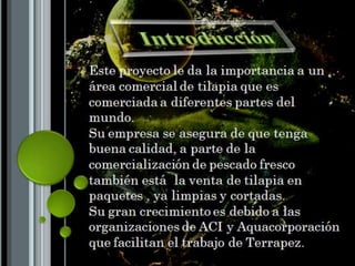 El documento describe la historia y operaciones de Terrapez, una empresa líder en la producción y exportación de tilapia en Costa Rica. Terrapez comenzó como parte del Grupo ACI, el cual ha estado produciendo tilapia en el país por más de 20 años y emplea a más de 1300 personas. La empresa opera granjas acuícolas, plantas de procesamiento, y se ha convertido en uno de los mayores exportadores mundiales de filetes de tilapia de alta calidad.