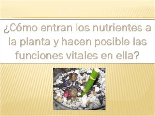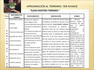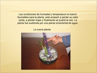 Este documento resume el progreso de un terrario a lo largo de varias semanas. Inicialmente, una planta ornamental murió debido a las condiciones inadecuadas, por lo que fue reemplazada por una planta acuática. La nueva planta creció bien y se agregó un caracol. Las observaciones mostraron que la planta traspira y empaña el vidrio, y continúa creciendo saludablemente con el caracol en el terrario.