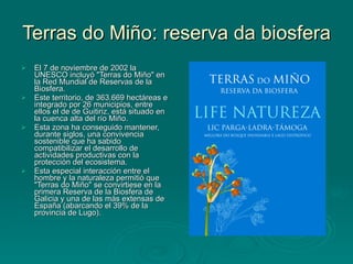 Este documento describe la Reserva de la Biosfera Terras do Miño en el noroeste de España, que fue designada por la UNESCO en 2002. Cubre 363,669 hectáreas y 26 municipios, y alberga una gran diversidad de ecosistemas como bosques de ribera, pastizales, ríos y lagos. Contiene muchas especies protegidas de plantas y animales. Las comunidades locales han logrado convivir de manera sostenible con la naturaleza durante siglos a través de la agricultura y la silvicultura tradicionales