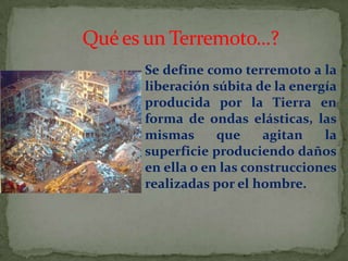 El documento define un terremoto como la liberación súbita de energía por la Tierra en forma de ondas elásticas que agitan la superficie. Explica que los terremotos son causados por la colisión de placas tectónicas o la deformación de la corteza terrestre. Además, señala que el Perú se ubica en la región del Cinturón de Fuego del Pacífico, una de las zonas sísmicas más activas del mundo.