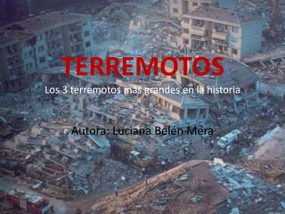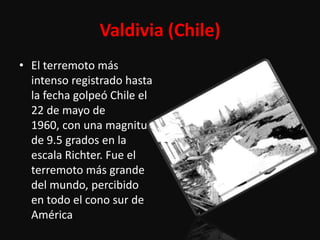 El documento describe los 3 terremotos más grandes registrados en la historia: el terremoto de Valdivia de 1960 en Chile con una magnitud de 9.5 grados, el terremoto de Alaska de 1964 con una magnitud de 9.2 grados que provocó un tsunami, y el terremoto de Sumatra-Andamán de 2004 con una magnitud de 9.1 grados que afectó a 14 países del sur de Asia y África.