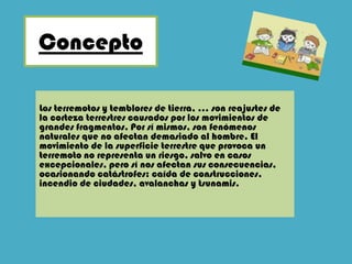 Los terremotos son causados por el movimiento de las placas tectónicas de la corteza terrestre, las cuales se mueven y liberan energía cuando la tensión entre ellas supera su fuerza de sujeción. La intensidad de los terremotos se mide en la escala de Richter de 1 a 9 y depende de la energía liberada. Los efectos de un terremoto, como daños a construcciones y ciudades, no solo dependen de su magnitud sino también de factores como la profundidad del epicentro, la geología del área y las té