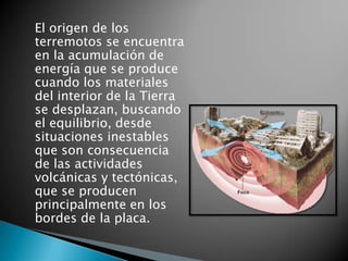 El documento explica que los terremotos se originan por la acumulación de energía cuando los materiales en el interior de la Tierra se desplazan buscando equilibrio, lo que ocurre principalmente en los bordes de las placas tectónicas. Otras causas de terremotos incluyen la acumulación de sedimentos, la modificación del régimen de precipitaciones, y variaciones bruscas en la presión atmosférica. Estos mecanismos generan eventos sísmicos de baja magnitud.