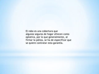 Los seguros de hogar pueden incluir una cobertura por robo, que debe ser contratada específicamente, y que ofrece diferentes niveles de cobertura dependiendo de si se asegura solo el continente o también el contenido. Es esencial distinguir entre robo, hurto y atraco, ya que las pólizas tienen exclusiones específicas, como objetos robados en espacios abiertos o la falta de medidas de seguridad. Además, es necesario presentar una denuncia policial para que la compañía cubra el siniestro.