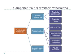 El documento describe los componentes del territorio de Venezuela, incluyendo su territorio continental de 915,175 km2, territorio insular de 1,270 km2, espacio marítimo de 860,000 km2, y territorio en reclamación de 159,542 km2. Además, analiza conceptos de derecho marítimo como el mar territorial, zona económica exclusiva y plataforma continental, e incluye mapas que muestran la distribución política y física del territorio venezolano.