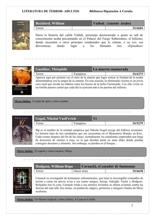 Este documento es una guía de lectura de libros de terror para adultos de la Biblioteca Provincial de A Coruña. Presenta resúmenes de varias obras literarias de terror clásicas como Vathek de William Beckford, La muerta enamorada de Théophile Gauthier, It de Stephen King, entre otros. Incluye información sobre los autores, títulos, géneros y ubicaciones de los libros en la biblioteca.