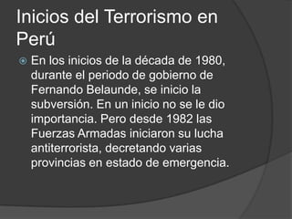 El documento resume los orígenes y desarrollo del terrorismo en el Perú en las décadas de 1980 y 1990, mencionando la aparición de grupos como Sendero Luminoso y el MRTA y algunas de sus acciones más destacadas, así como el contexto social y económico que propició su surgimiento. También describe brevemente la Comisión de la Verdad y Reconciliación creada para investigar el conflicto armado interno.