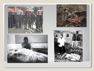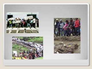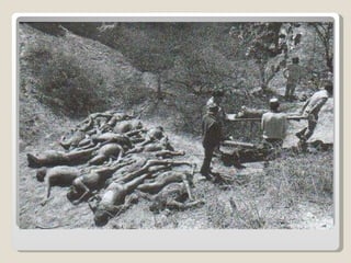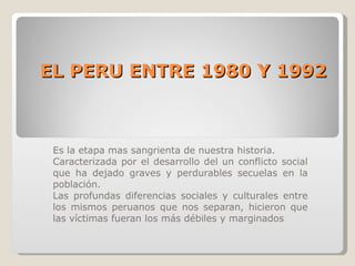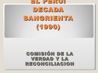 El documento resume la década de violencia en el Perú entre 1980 y 2000. Menciona que más de 40,000 personas murieron de forma violenta y 6,000 desaparecieron durante este periodo. El principal responsable fue el grupo terrorista Sendero Luminoso, responsable del 54% de las muertes. El gobierno peruano no estuvo preparado para enfrentar el conflicto y cometió graves violaciones a los derechos humanos. La población campesina fue la principal víctima de la violencia.