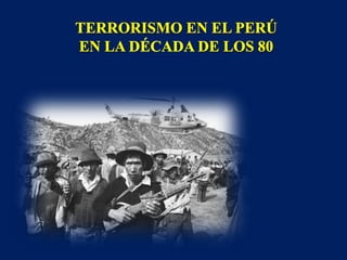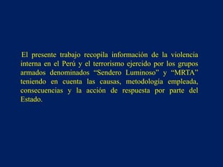 El documento proporciona información sobre el terrorismo en el Perú perpetrado por los grupos Sendero Luminoso y MRTA en las décadas de 1980 y 1990. Explica los orígenes, ideologías, acciones violentas y consecuencias de estas organizaciones, así como sus procesos evolutivos. También define conceptos clave como terrorismo, violencia política y delitos políticos.