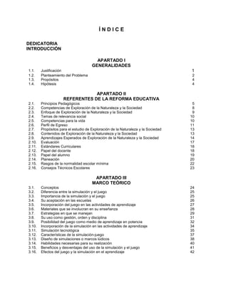 El documento presenta un proyecto de investigación sobre el uso de la simulación y el juego para favorecer el aprendizaje de Exploración de la Naturaleza y la Sociedad en primer grado de primaria. El proyecto incluye la justificación, planteamiento del problema, propósitos e hipótesis. También presenta los referentes de la reforma educativa y el marco teórico relacionado con la simulación y el juego. Finalmente, propone un plan de intervención y concluye resumiendo los resultados esperados.
