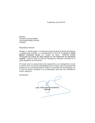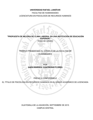 El resumen analiza el clima organizacional de una institución de educación superior en Guatemala con el objetivo de proponer un plan de mejora. La investigación aplicó un cuestionario a 649 colaboradores administrativos para medir el clima. Los resultados mostraron que el clima es generalmente saludable pero se necesitan acciones como un plan de carrera y reconocimiento para elevar la satisfacción. Se recomienda que la institución implemente un proceso de comunicación de resultados, un plan de carrera que brinde oportunidades de crecimiento y un programa de