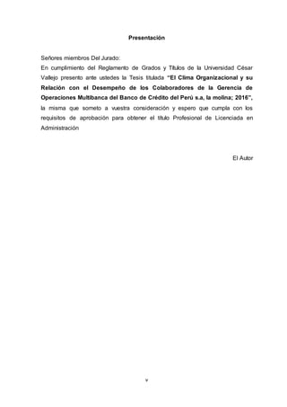 Este resumen describe la tesis de Pedro Gonzales Paredes titulada "El Clima Organizacional y su Relación con el Desempeño de los Colaboradores de la Gerencia de Operaciones Multibanca del Banco de Crédito del Perú s.a, la molina; 2017". El objetivo general de la tesis fue determinar la relación entre el clima organizacional y el desempeño de los colaboradores de la Gerencia de Operaciones Multibanca del Banco de Crédito del Perú. La población estuvo conformada por 50 colaboradores y la muestra