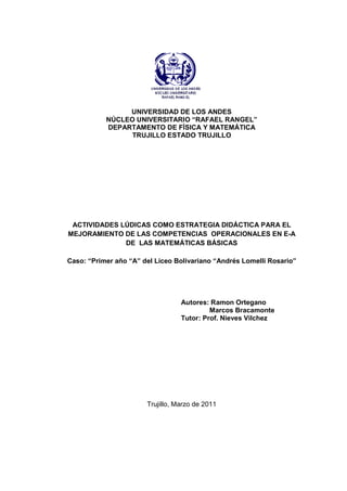 Este documento presenta el planteamiento del problema de investigación sobre el uso de actividades lúdicas como estrategia didáctica para mejorar las competencias operacionales en matemáticas básicas de estudiantes de primer año de bachillerato. Señala que el objetivo es evaluar el impacto de las actividades lúdicas en el aprendizaje de contenidos matemáticos. Justifica la investigación debido a que tradicionalmente la enseñanza de matemáticas ha sido memorística, generando bajo rendimiento. Delimita el est
