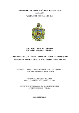Este estudio evaluó los conocimientos, actitudes y creencias sobre el aborto inducido en 126 estudiantes adolescentes de 15 a 19 años de dos colegios en Matagalpa, Nicaragua. La mayoría de los estudiantes no sabían las condiciones legales para el aborto terapéutico ni la proporción de países que lo permiten. Casi la mitad creía que el aborto era frecuente en Matagalpa y conocían a alguien que lo había realizado. La mayoría no distinguía entre aborto terapéutico y provocado. Consideraban que la planific