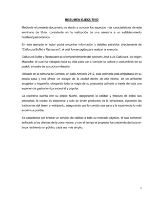 El documento resume la información sobre el restaurante Calfucura Buffet y Restaurant, un emprendimiento gastronómico ubicado en Santiago que ofrece comida mapuche. El restaurante fue fundado por José Luis Calfucura y se caracteriza por difundir la cultura y gastronomía mapuche a través de platos tradicionales cocinados con ingredientes de la región. El restaurante ha crecido en popularidad debido a su enfoque diferenciado y ofrece servicios de restaurante y banquetería.