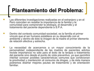 Este documento describe un estudio sobre la codependencia materna y su relación con el tratamiento de pacientes adictos a sustancias psicoactivas en un centro de tratamiento. El estudio busca describir los niveles de codependencia materna y determinar si existe una relación entre los niveles de codependencia y la eficacia del tratamiento. Se utilizarán cuestionarios para evaluar la codependencia materna y analizar su relación con los resultados del tratamiento.