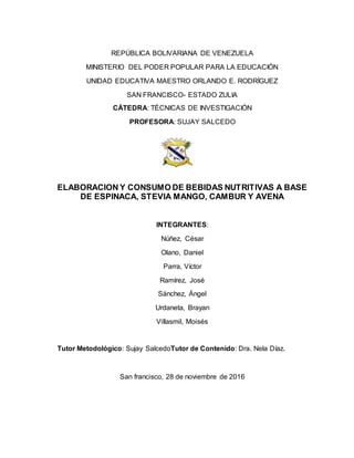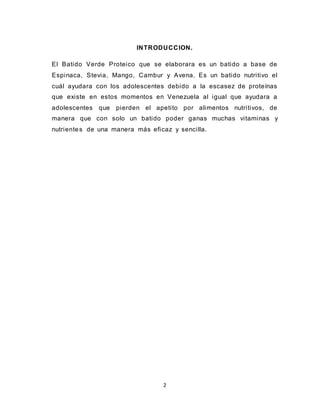Este documento presenta la elaboración de una bebida verde proteica a base de espinaca, stevia, mango, cambur y avena por un grupo de estudiantes en Venezuela. El objetivo es crear una bebida nutritiva que ayude a combatir la falta de proteínas y vitaminas en los adolescentes. Se revisan las propiedades y beneficios nutricionales de cada ingrediente y se describe el proceso metodológico de la investigación.