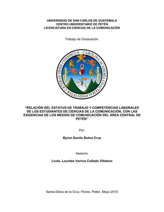 Este documento presenta el trabajo de graduación de Byron Danilo Boteo Cruz para obtener el título de Licenciado en Ciencias de la Comunicación. El trabajo examina la relación entre el estatus laboral y las competencias de los estudiantes y egresados del programa con los requerimientos de los medios de comunicación en el área central de Petén, Guatemala. El trabajo fue realizado bajo la asesoría de Lourdes Varinia Collado Villatoro y presentado al Centro Universitario de Petén de la Universidad de San Carlos de Guatemala.