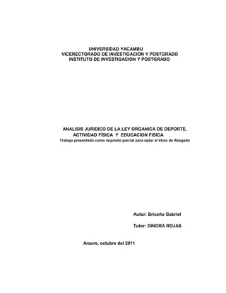 Este documento presenta un análisis jurídico de la Ley Orgánica de Deporte, Actividad Física y Educación Física de Venezuela. El autor examina los impactos positivos y negativos de la ley, incluyendo la centralización de los órganos deportivos y las estrictas regulaciones sobre el patrocinio privado que podrían debilitar el deporte venezolano. El objetivo es determinar el efecto de la ley en la sociedad y describir sus ventajas y desventajas para minimizar posibles consecuencias.