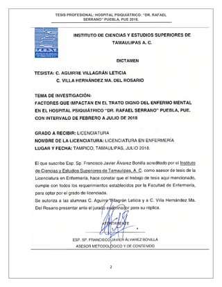 Este documento presenta una tesis profesional sobre factores que impactan el trato digno de pacientes en el Hospital Psiquiátrico "Dr. Rafael Serrano" en Puebla, Puebla. El objetivo es determinar dichos factores entre febrero y julio de 2018. Se realizó un estudio cuantitativo, prospectivo, observacional y transversal analizando la problemática de pacientes mentales en el hospital para identificar factores. Los resultados mostraron que el 89% del personal de enfermería tiene una actitud positiva hacia los pacientes, mientras que el