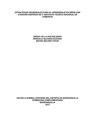 Este documento presenta una propuesta pedagógica que busca desarrollar estrategias sensoriales para potenciar el aprendizaje en niños con atención dispersa de 3er grado en el Instituto Técnico Nacional de Comercio. La propuesta incluye un marco referencial que analiza antecedentes investigativos sobre el tema, así como los fundamentos teóricos relacionados con el desarrollo integral del niño, las inteligencias múltiples y el aprendizaje significativo. Adicionalmente, presenta los objetivos y metodología