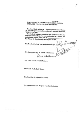 La tesis doctoral analiza las limitaciones de traducir el sentido del humor en textos literarios. La autora, Margaret Hart, argumenta que el humor se basa en referencias culturales que son difíciles de transmitir en otra lengua. Examina cómo factores como la ironía, el doble sentido y las alusiones están arraigados en una cultura particular y se pierden fácilmente en la traducción. Concluye que aunque los traductores deben intentar capturar el efecto cómico, es imposible lograr una traducción perfecta que transmita por completo el sentido