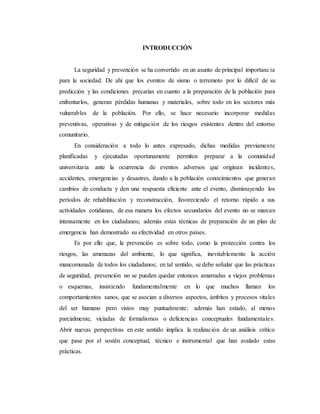 Este documento presenta un plan de emergencia ante sismos o terremotos para la comunidad de la Universidad Experimental de las Fuerzas Armadas (UNEFA) en La Fría, Venezuela. Introduce el problema de la vulnerabilidad ante desastres y la importancia de la preparación. Explica que Venezuela ha sufrido terremotos devastadores en el pasado y que la zona del estado Táchira presenta riesgo sísmico. Actualmente la UNEFA cuenta con una sola vía de entrada y salida y carece de señalización adecuada de rutas