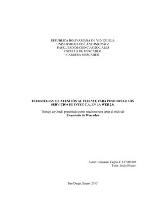 1) El documento presenta una investigación sobre estrategias de atención al cliente para posicionar los servicios de la empresa INTEC C.A. en la web 2.0.