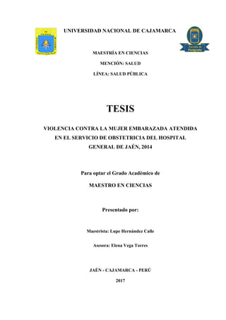 Este documento trata sobre la violencia contra la mujer embarazada atendida en el servicio de obstetricia del Hospital General de Jaén en el año 2014. El objetivo de la investigación fue determinar los factores de la violencia contra estas mujeres. Se concluyó que el tipo de violencia que predominó fue la psicológica, seguida de la física y la sexual. Los principales factores asociados a la violencia fueron la edad de 20 a 29 años, nivel de instrucción primaria completa y ocupación como ama de casa, así como antecedentes