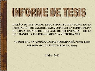 Este documento propone estrategias educativas basadas en la formación de valores para superar la indisciplina de los estudiantes del primer año de secundaria de la Institución Educativa "Manuela Felicia Gómez" en Lima, Perú. Identifica la indisciplina como un problema y analiza teorías sobre valores y disciplina escolar. Luego, presenta cuatro estrategias clave: 1) clarificación de valores, 2) estudios de casos, 3) elaboración de un reglamento de convivencia, y 4) implementación de un programa de tutoría. El objetivo