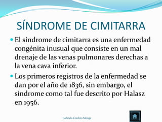 El documento describe el síndrome de cimitarra, incluyendo su etiología, manifestaciones clínicas, diagnóstico, tratamiento y cuidados de enfermería. El síndrome se produce por un mal drenaje de las venas pulmonares derechas a la vena cava inferior y causa dificultad respiratoria, infecciones pulmonares e hipertensión pulmonar. El tratamiento requiere cirugía correctiva temprana para conectar las venas pulmonares a la aurícula izquierda.